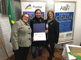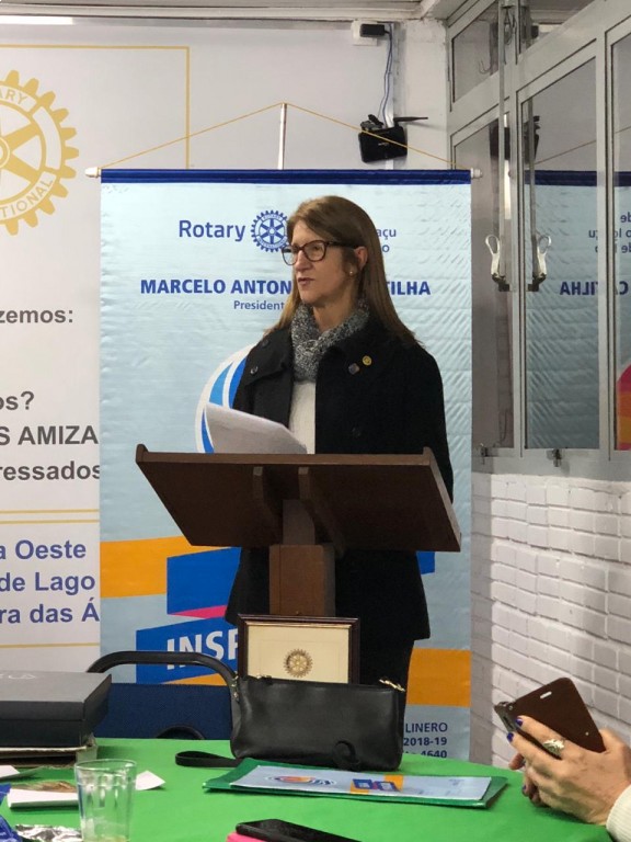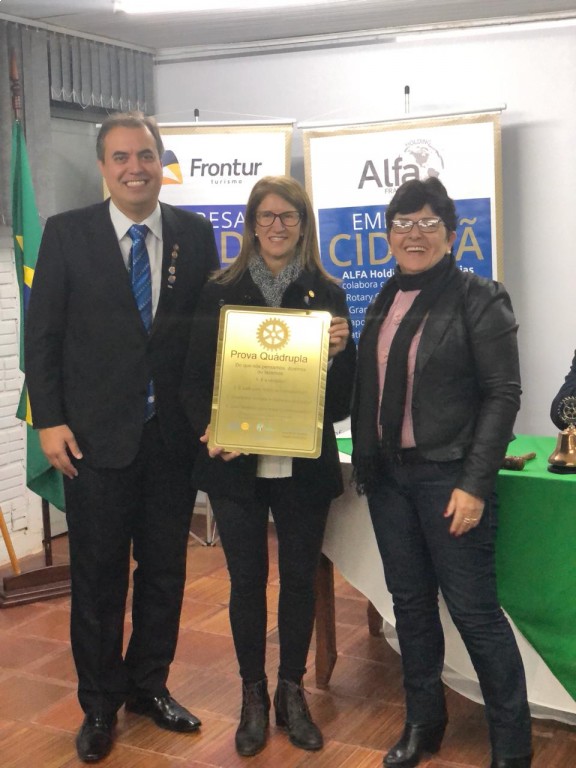 Os companheiros Governadores Assistentes 2017/2018 Ivone Camargo e Cláudio Gilardi Britos entregaram uma lembrança pessoal à presidente 2017/2018 Marinez Rubert Brandt, uma placa da prova quádrupla.