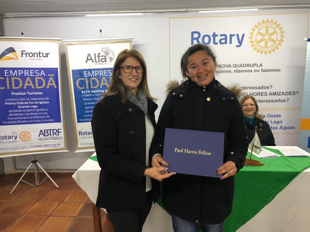 Na reunião ordinária do Rotary Club de Foz do Iguaçu-Grande Lago em 10 de julho, a companheira Dalzira Araújo Silveira recebeu o inédito Reconhecimento Título Paul Harris do Rotary Internacional, por fazer a diferença na prestação de serviços a comunidade e no mundo todo.