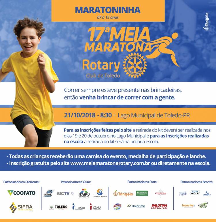 O EVENTO ACONTECERÁ NO DIA 21/10/2018 EM TOLEDO - INSCRIÇÕES PELO SITE http://www.meiamaratonarotary.com.br