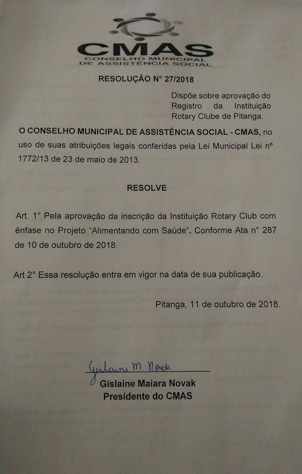 Rotary Club de Pitanga tem sua aprovação no Conselho Municipal de Assitência Social.