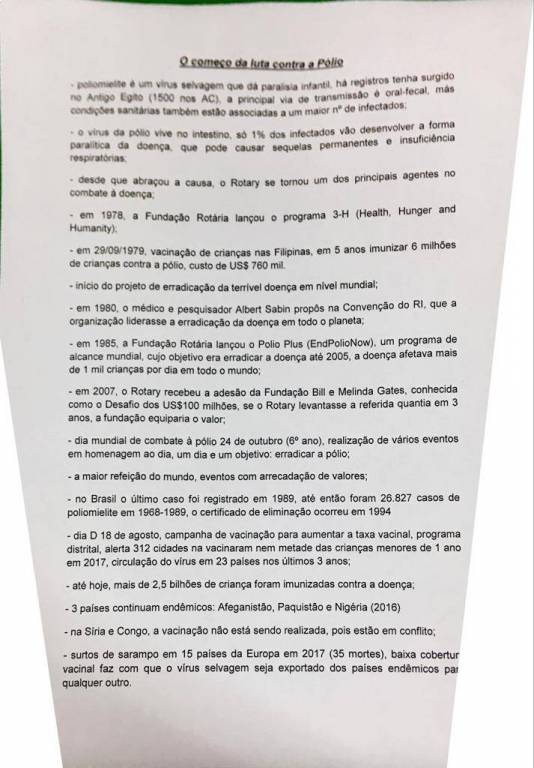 Sob a presidência do companheiro Marcelo Antônio de Castilha e a secretária Wilza compondo a mesa diretiva, os trabalhos tiveram as seguintes pautas: instrução rotária sobre a poliomielite, projeto banco de fraldas geriátricas, passeio ciclístico solidário e projeto Taekwondo.