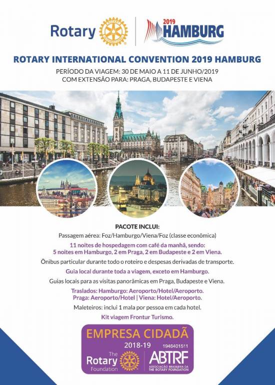 Em 2019 a convenção irá acontecer em Hamburgo na Alemanha de 01 a 05 de junho, e todos os detalhes estão sendo devidamente preparados, para que toda a família rotária possa participar.