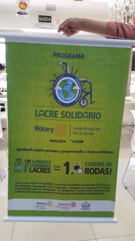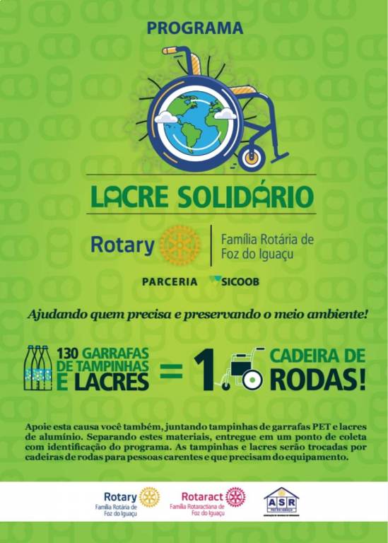 O programa Lacre Solidário de toda a família rotária iguaçuense, visa envolver a sociedade para ajudar na ação socioambiental a recolher lacres de alumínio e tampinhas de garrafas pets em troca de cadeiras de rodas e também de banho para as pessoas que realmente necessitam e não possuem condições financeiras.