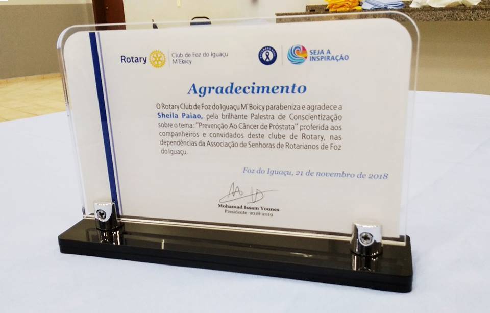 Nesta quarta-feira, 21 de novembro, companheiros do Rotary Club de Foz do Iguaçu M´Boicy puderam presenciar uma palestra destinada ao combate do câncer de próstata, proferido pela enfermeira convidada Sheila Paiao, a palestra aconteceu na Casa da Amizade, em conjunto com a reunião semanal do clube.
