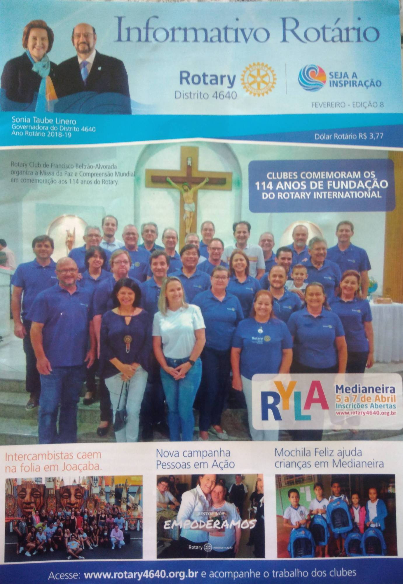 O RCFB ALVORADA é capa do informativo rotário do distrito 4640 de fevereiro de 2019. Foto tirada após a missa da paz e compreensão mundial.