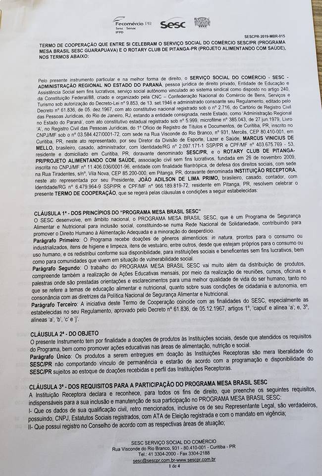 Parceria do Rotary Club de Pitanga com o Projeto Mesa Brasil do SESC.