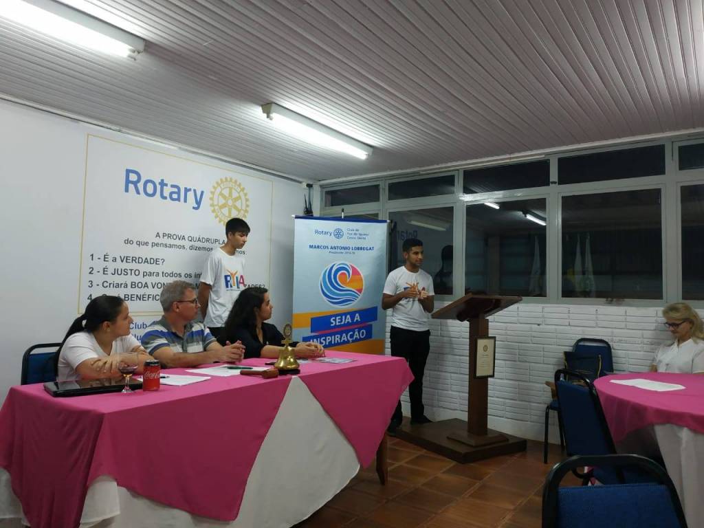 Recebemos a visita dos dois jovens, Cleison e Alisson, que participaram do RYLA, em Medianeira, e os mesmos explanaram com muita riqueza de detalhes a experiência vivida no encontro. Nesta reunião estava presente a Presidente do Rotaract Club Terra das Águas, que no momento da apresentação do joven Cleison, formalizou o convite para que ele participe do Rotaract Club de Foz do Iguaçu Terra das Águas e o jovem Alisson será encaminhado ao Interact Club.
