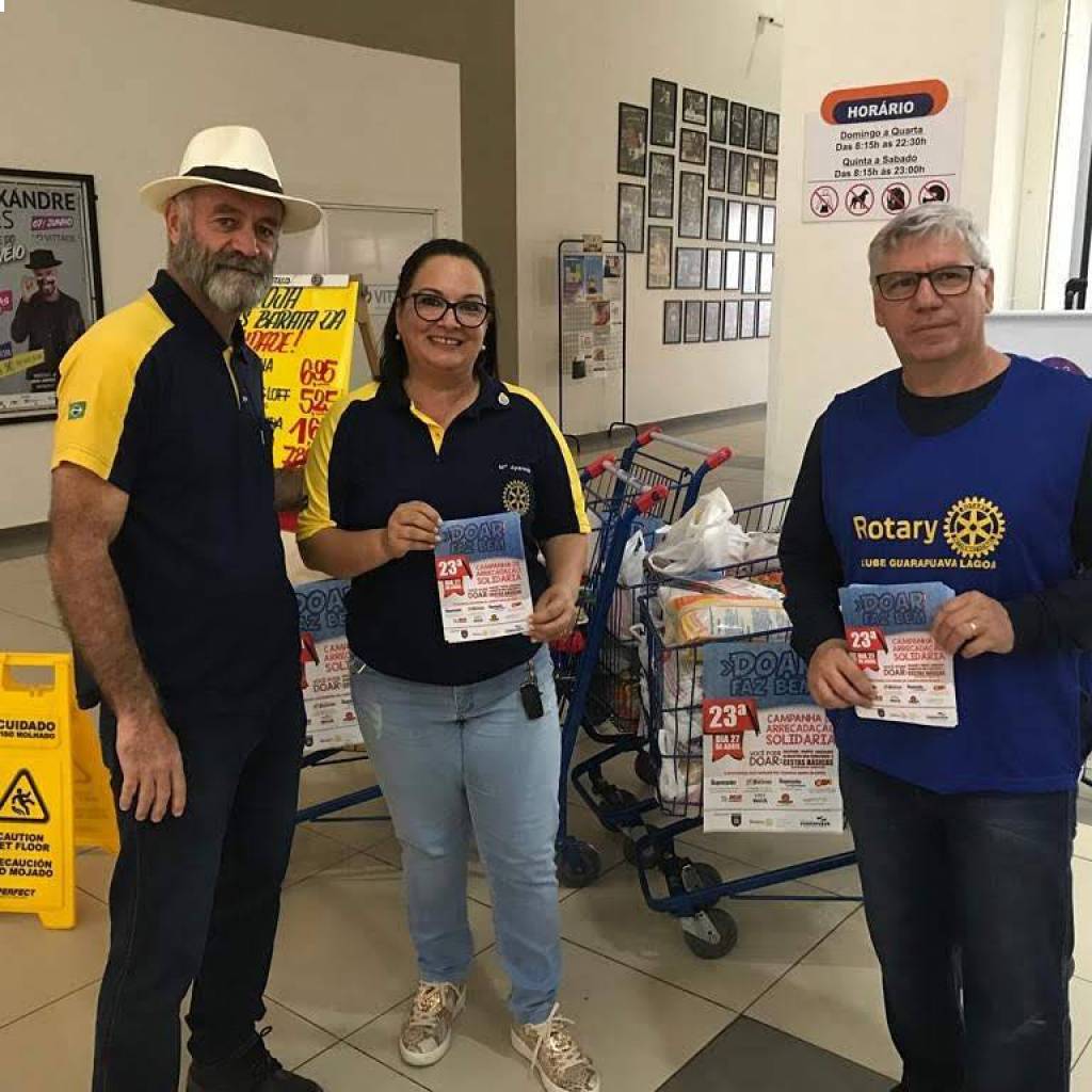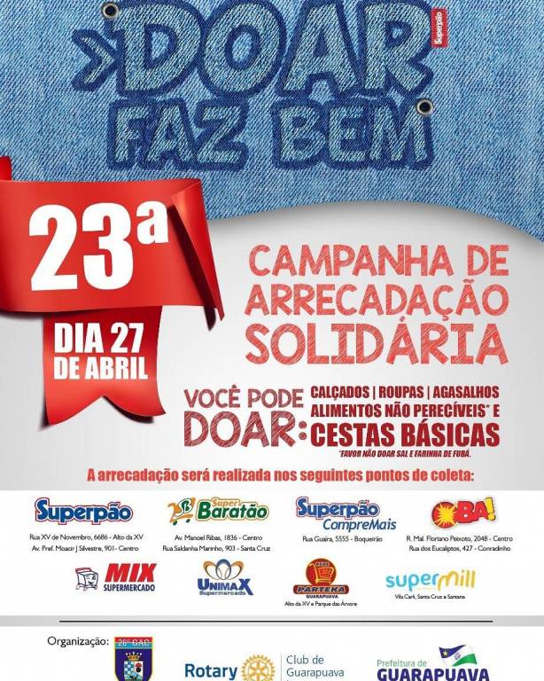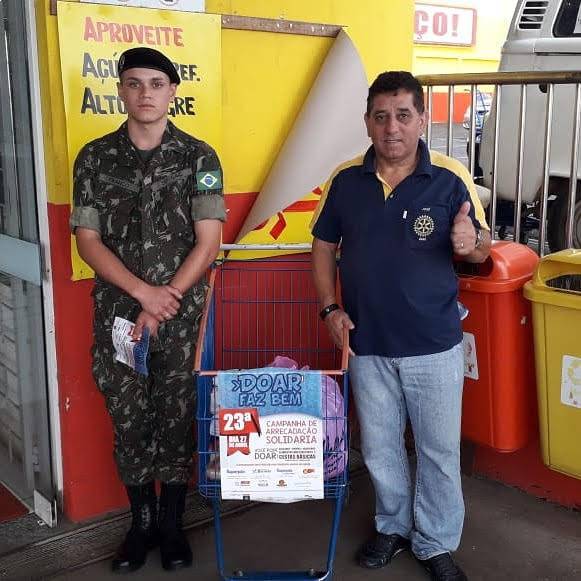 A 23ª ARRECADAÇÃO SOLIDÁRIA ACONTECEU NESTE SÁBADO DIA 28 DE ABRIL, NO MUNICÍPIO DE GUARAPUAVA. O OBJETIVO DA ARRECADAÇÃO SOLIDÁRIA FOI A ARRECADAÇÃO DE ALIMENTOS NÃO PERECÍVEIS, CALÇADOS E ROUPAS QUE OCORREU EM PARCERIA DO ROTARY CLUB GUARAPUAVA LAGOA, 26º GRUPO DE ARTILHARIA DE CAMPANHA E PREFEITURA MUNICIPAL DE GUARAPUAVA. A ARRECADAÇÃO OCORREU EM 14 SUPERMERCADOS DE GUARAPUAVA E TAMBÉM COM A ARRECADAÇÃO NOS BAIRROS DA CIDADE COM OS CAMINHÕES DO EXÉRCITO.