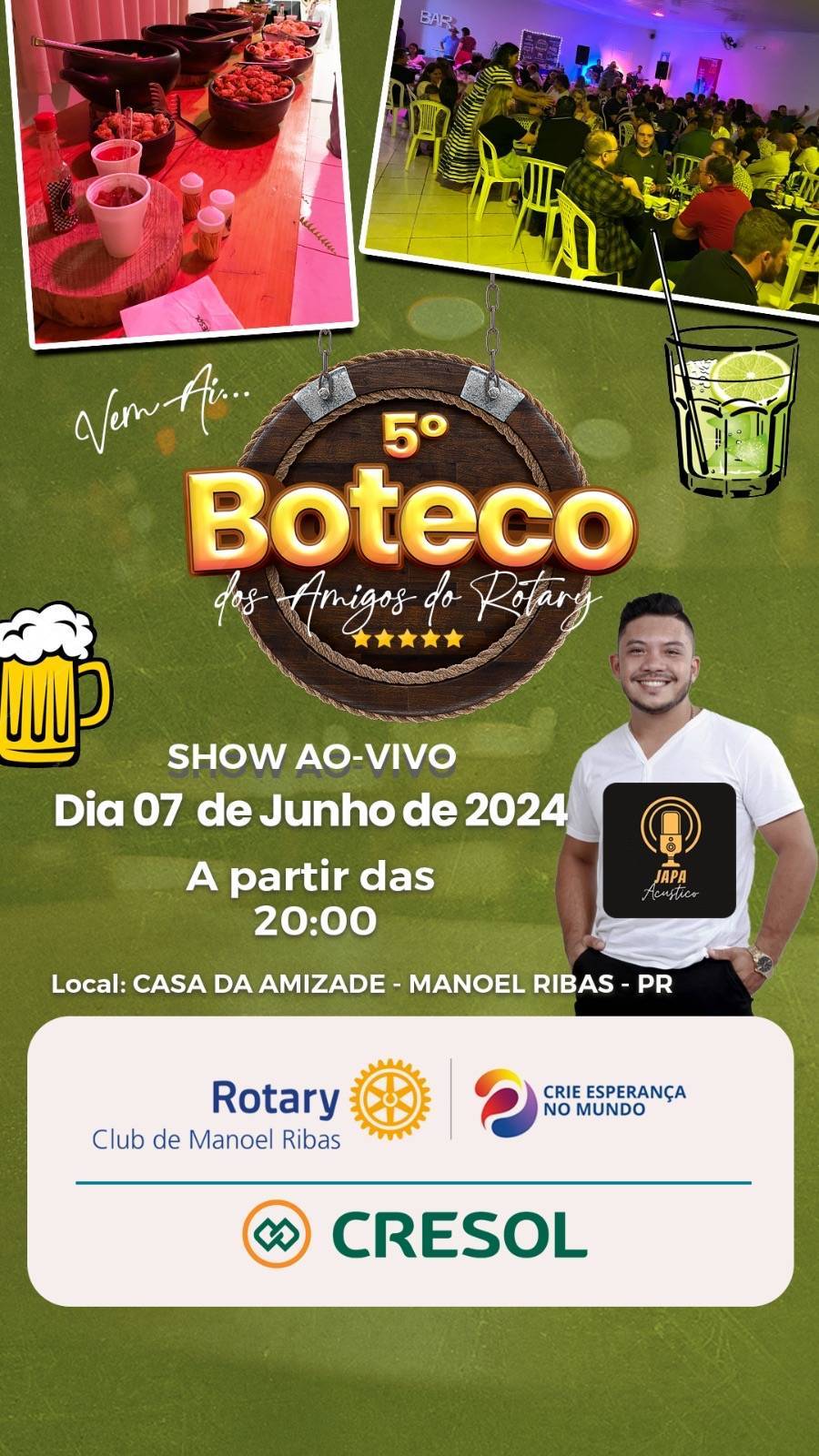 Sexta feira dia 07 de junho aconteceu o 5º Boteco dos Amigos de Rotary na Casa da Amizade, onde mais um ano foi um sucesso graças a participação e a presença dos amigos e também o Cantor Japa que animou o evento com uma participação do Charles que também nos agraciou cantando algumas músicas, mais uma vez agradecemos a todos por nos prestigiar e aos companheiros e companheiras que sempre estão a disposição para ajudar nas causas d Rotary.
