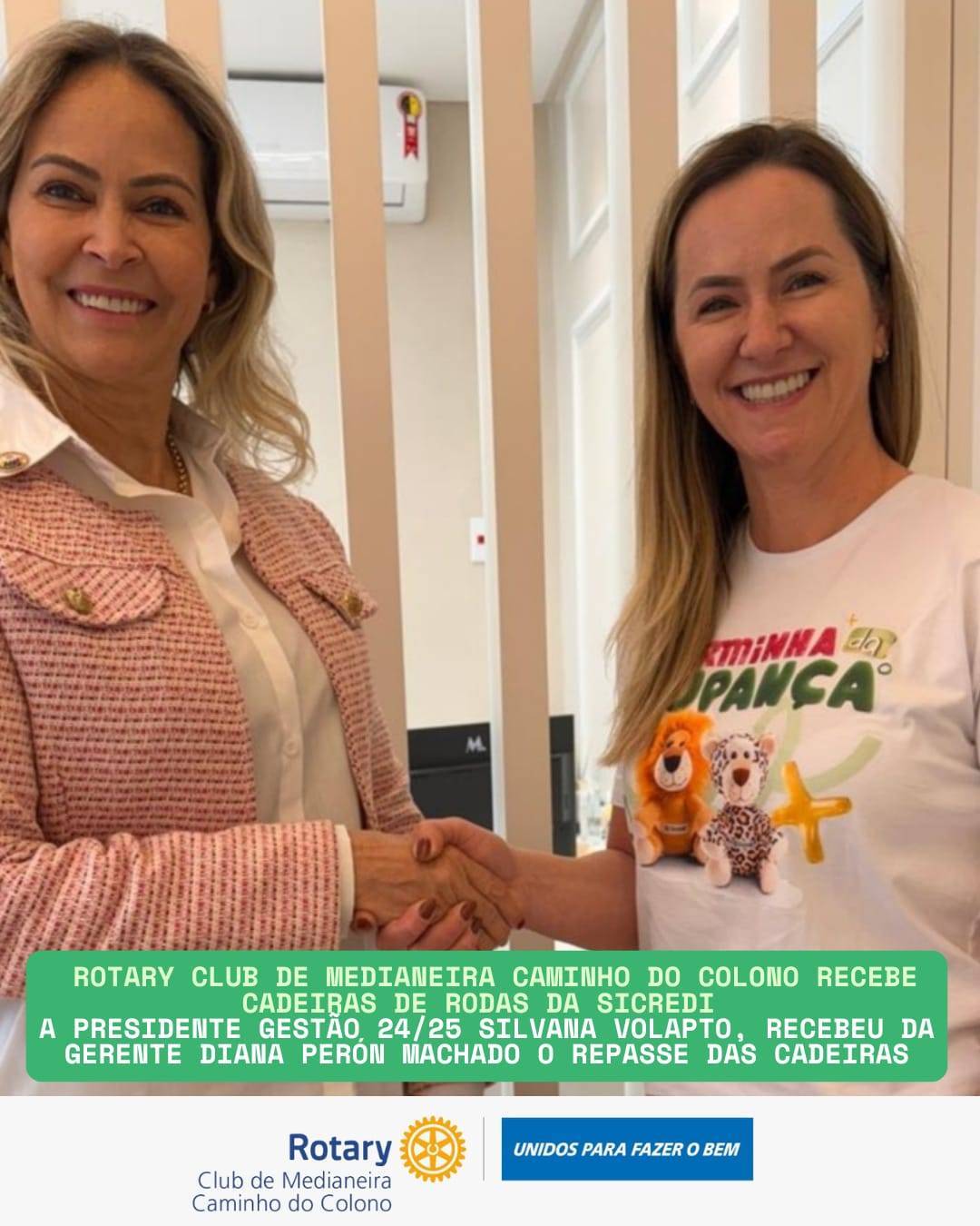 🤝O Rotary Club de Medianeira Caminho do Colono recebeu, nesta semana, a doação de 5 cadeiras de rodas e 5 cadeiras de banho, entregues pela gerente da Sicredi, Diana Perón Machado, à presidente da gestão 2024/2025, Silvana Volpato.