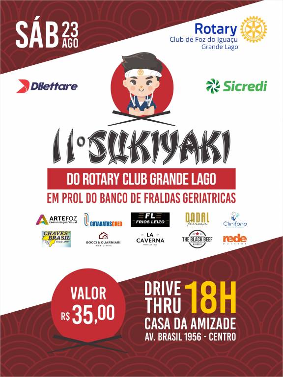O Rotary Club de Foz do Iguaçu Grande Lago está nos preparativos do 11º Sukiyaki Solidário, que ocorrerá no dia 23 de agosto, a partir das 18h, no sistema Drive Thru.