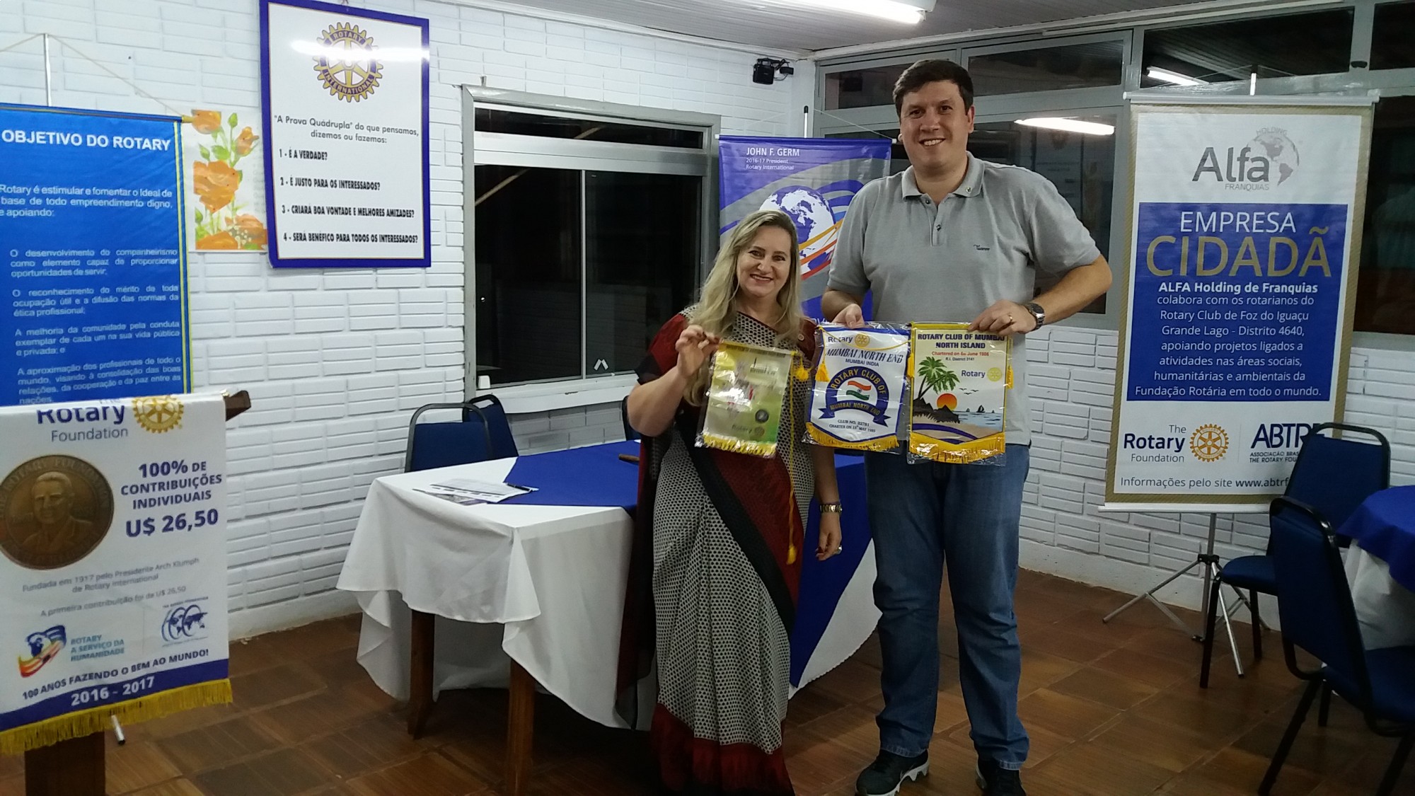 Recebemos a visita da Sra. Ivone Kolachinski do RCFI Três Fronteiras que visitou a Índia pelo no Discon 2017 representando o RCFI Grande Lago onde acompanhou jovens do Rotaract e outros companheiros rotarianos no  Programa New Generation Service Exchange. Nos contou curiosidades dos Rotarys da Índia, suas cidades e habitantes, mostrando fotos e vestida a caráter. Também nos presenteou com flâmulas dos clubes que visitou.