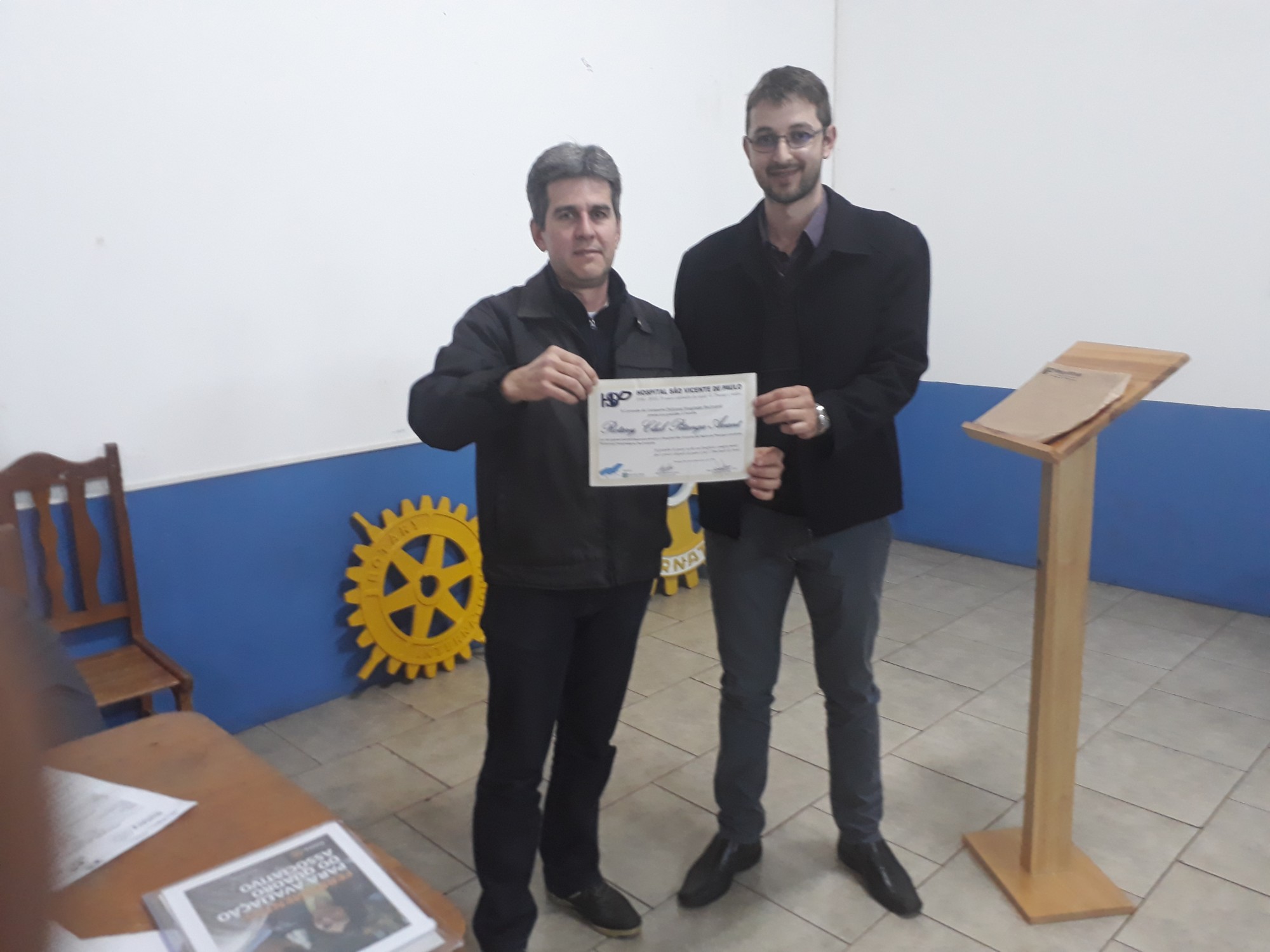 Presidente do Rotary Club de Pitanga Avante recebe certificado do Diretor Administrativo do Hospital são Vicente de Paulo.
